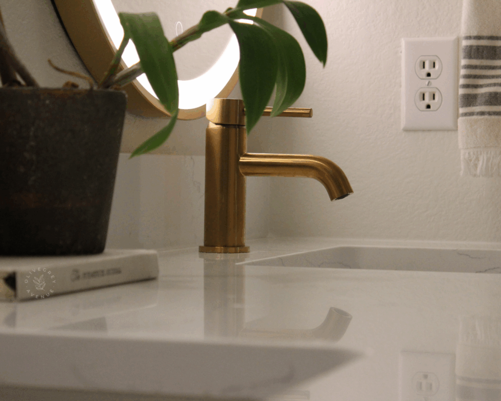 Fixtures are one of the hardest design decisions to make because there are so many options out there. My #1 fool-proof tip is to shop from a coordinated collection. That way, all your metal tones and finishes are guaranteed to match. I used the Lexia collection from Signature Hardware throughout this home–faucets, towel ring, robe hooks, shower system, toilet paper holder–everything. I could get in that collection, I got to match. I even tried to match the kitchen faucet to the bathroom fixtures (here’s a sneak peek!)