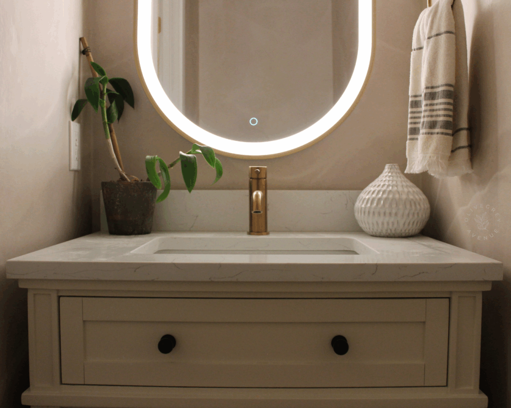 You don’t want multiple pieces competing to be the star of the show. Instead, choose one big statement feature to get all the attention, and let the rest of the design play supporting roles. I’m tempted to say that the Elmdale vanity is the star of our show–but it’s not. I don’t think you can truly appreciate how transformative the illuminated Faysel mirrors are until you walk into the room. There’s this subtle pull that makes you want to linger and soak in the space. That’s why I’d say the mirrors are our statement piece. They quite literally make the entire room what it is.