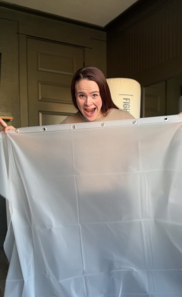 You take your frosted shower curtain and completely cover the window you want to project your videos on. I used the frosted shower curtain because it’s not too thick and still somewhat translucent so you can see the projected images. It doesn’t have to be pretty inside, just make sure your curtain is pulled taut over the window. I used 3M stickies to secure it.