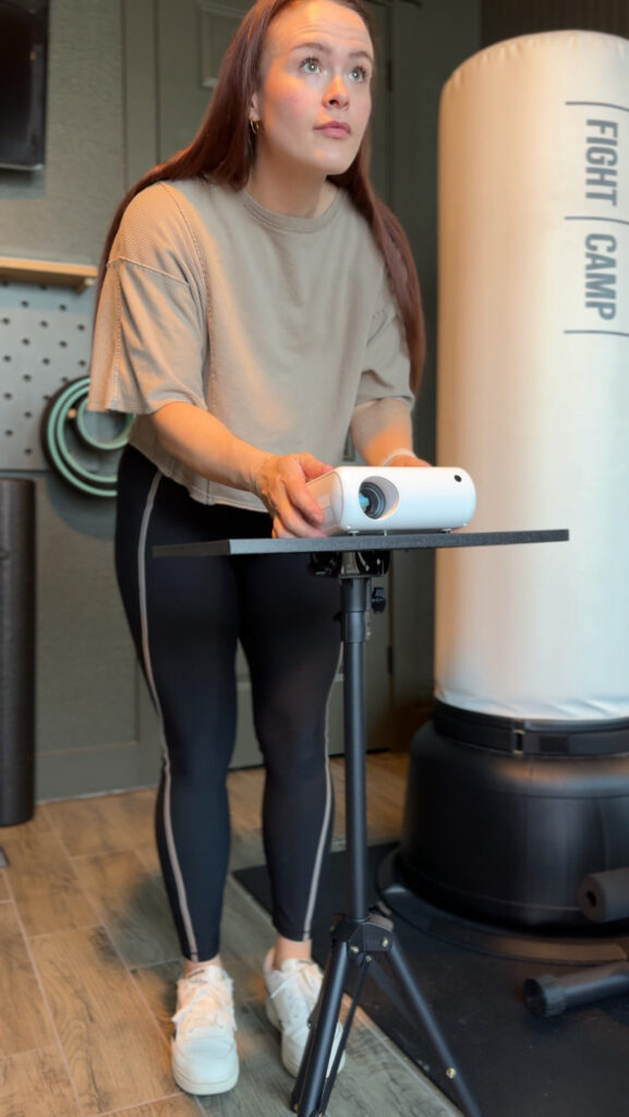 Then setup your projector facing the window from inside the house. You can move it back and forth or adjust the image size on the projector to fill the window. You’ll need to do this at dusk or nighttime so you can see it best.