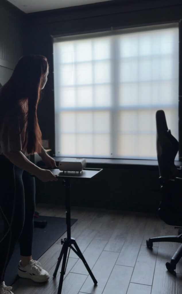 The projector is inside, not outside, in the room with a window most visible from the street. The projector is sitting on an adjustable stand to bring it to the right height but you could also use a table if you have one at the right height.